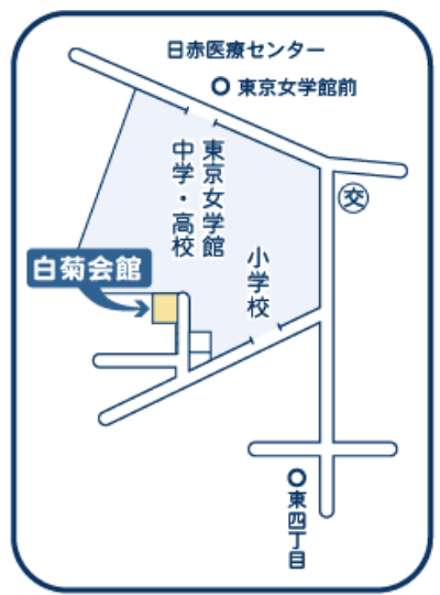 会館は、母校(広尾校舎)の北西に位置しています。会館の前は駐車禁止です。